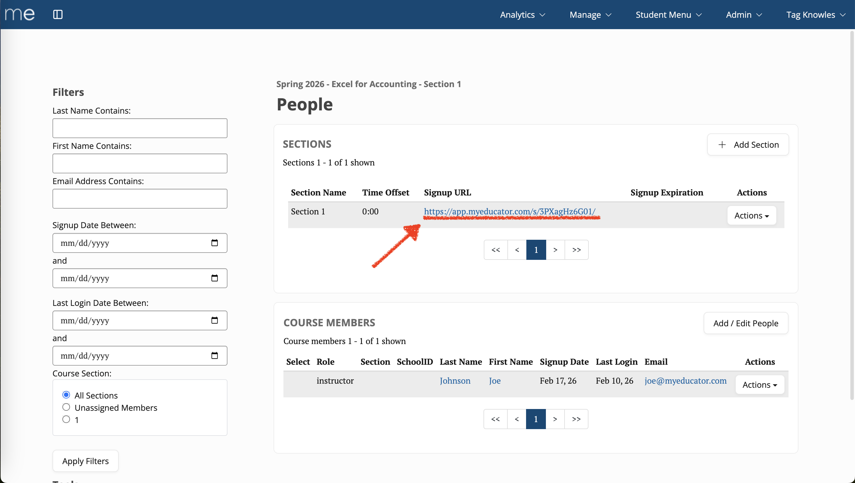 3. The "People" page will display a Signup URL in the "Sections" portion of the page.