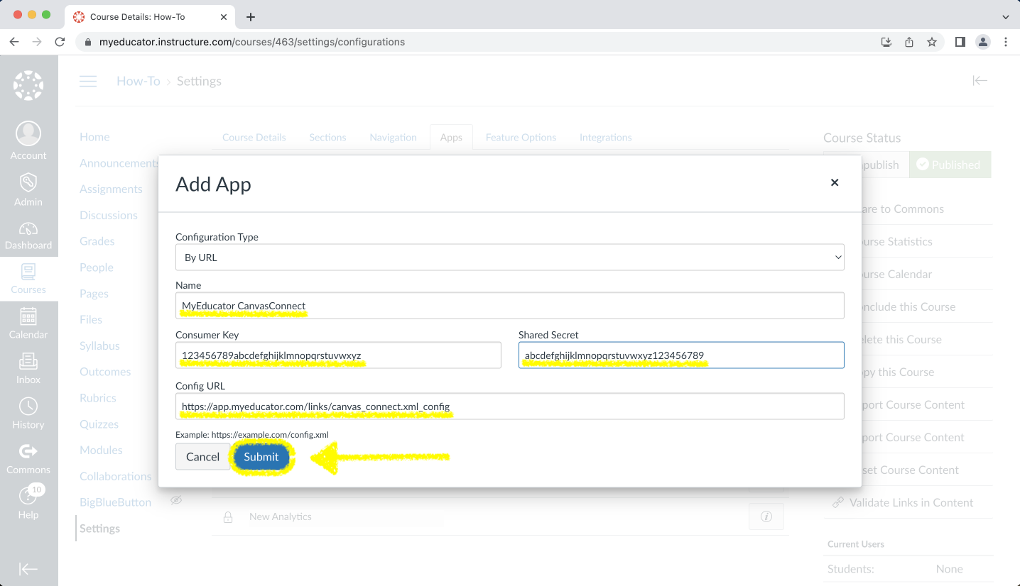 You will need institution specific Consumer Key and Shared Secret values provided to you by your MyEducator representative to complete this process.