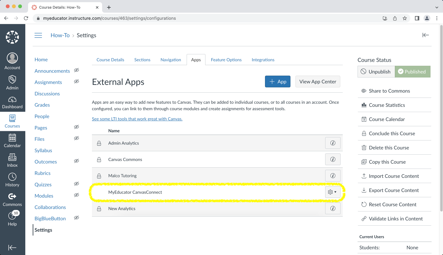 To verify if the MyEducator CanvasConnect external tool has been installed by your Canvas administrators at the Canvas institutional level, refer to this guide.